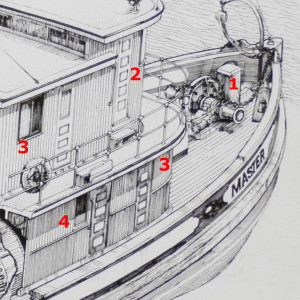 The steam anchor winch (1) is located at the bow of the ship. There are four crew births located below deck as well as one crew cabin 3), starboard side on the main deck. The galley (4) is just aft of the crew cabin. The wheel house and captain’s quarters (2) and first mate’s cabin (3) are on the top deck. When working, she carried a crew of seven, 3 Engine Room Crew, 2 Deck Hands and a Captain & 1st Mate, however She has bunks for nine.