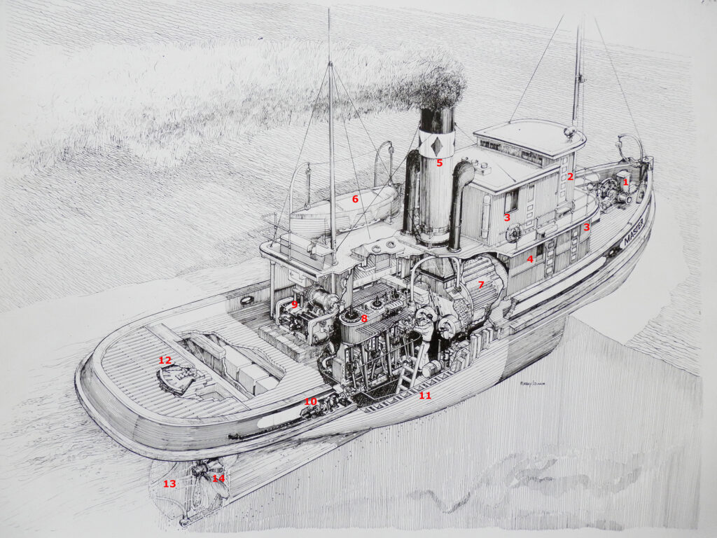 The heart of the ship is the triple expansion steam engine (8) which was made in 1916 in the UK. Steam for the engine is produced in the 10 ton Scotch Boiler (7). Two burners provide heat to generate steam and the burners can use diesel fuel or bunker oil. The hull (11) has 3″ outer planks, 8″ ribs and 2″ inner planks. The gap between the inner and outer planks was originally filled with salt.