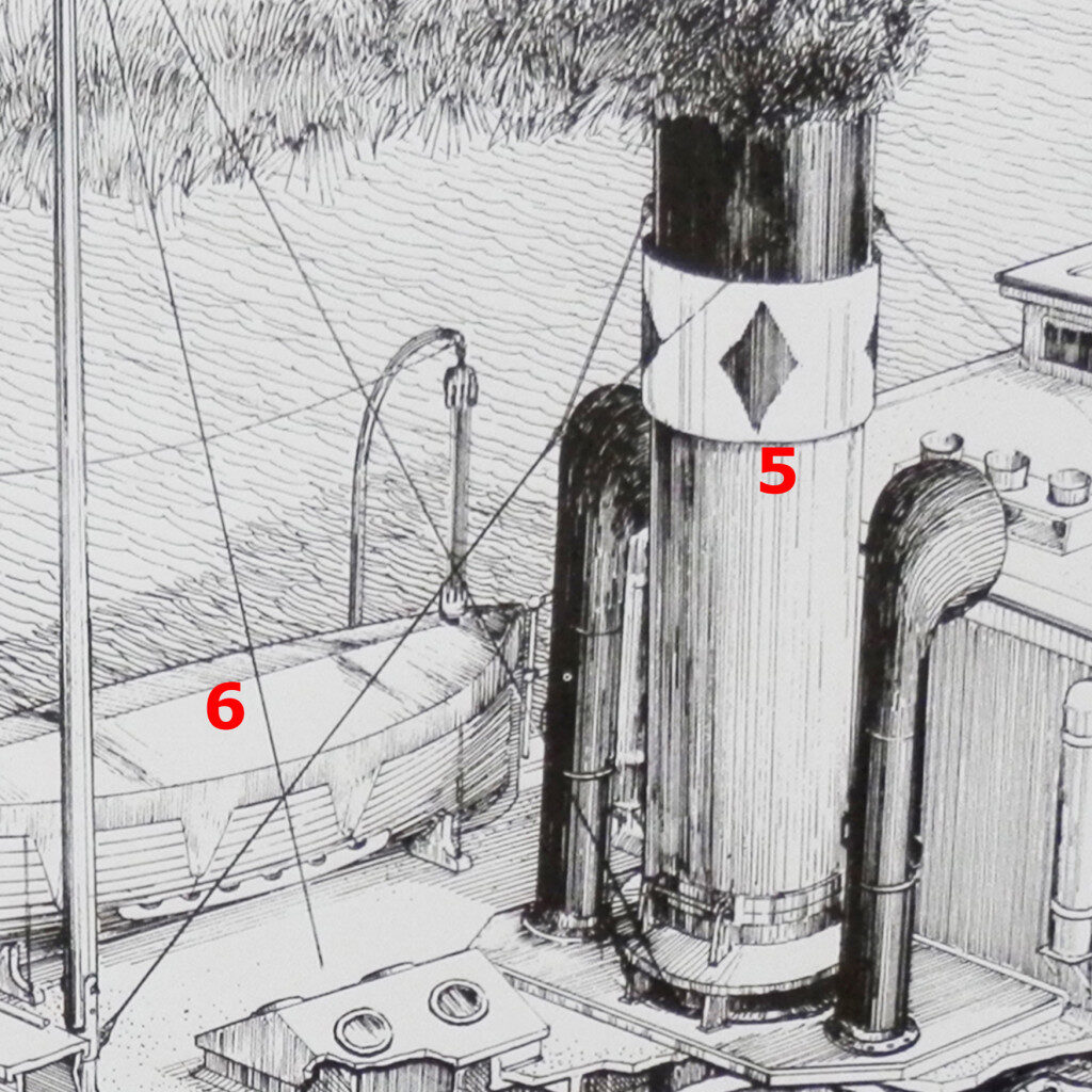 The massive smoke stack (5) is located aft of the crew cabins on the upper deck. Large are air scoops on either side of the stack provide combustion air required for the huge 10 ton boiler below the main deck. Two life boats (6), one starboard and one port side, are hung on davits, mounted on the top deck.