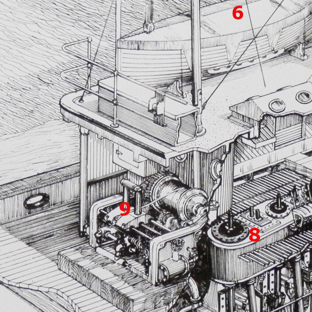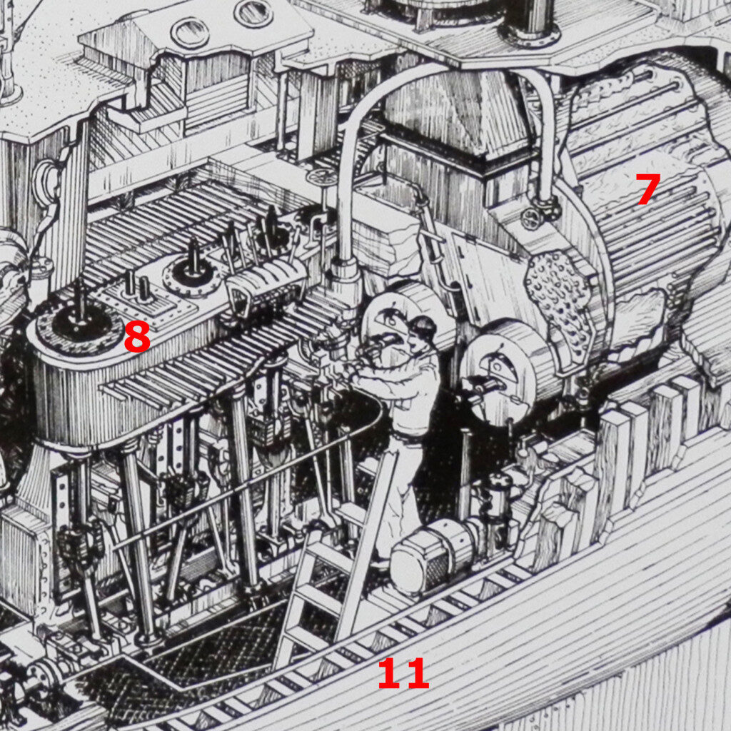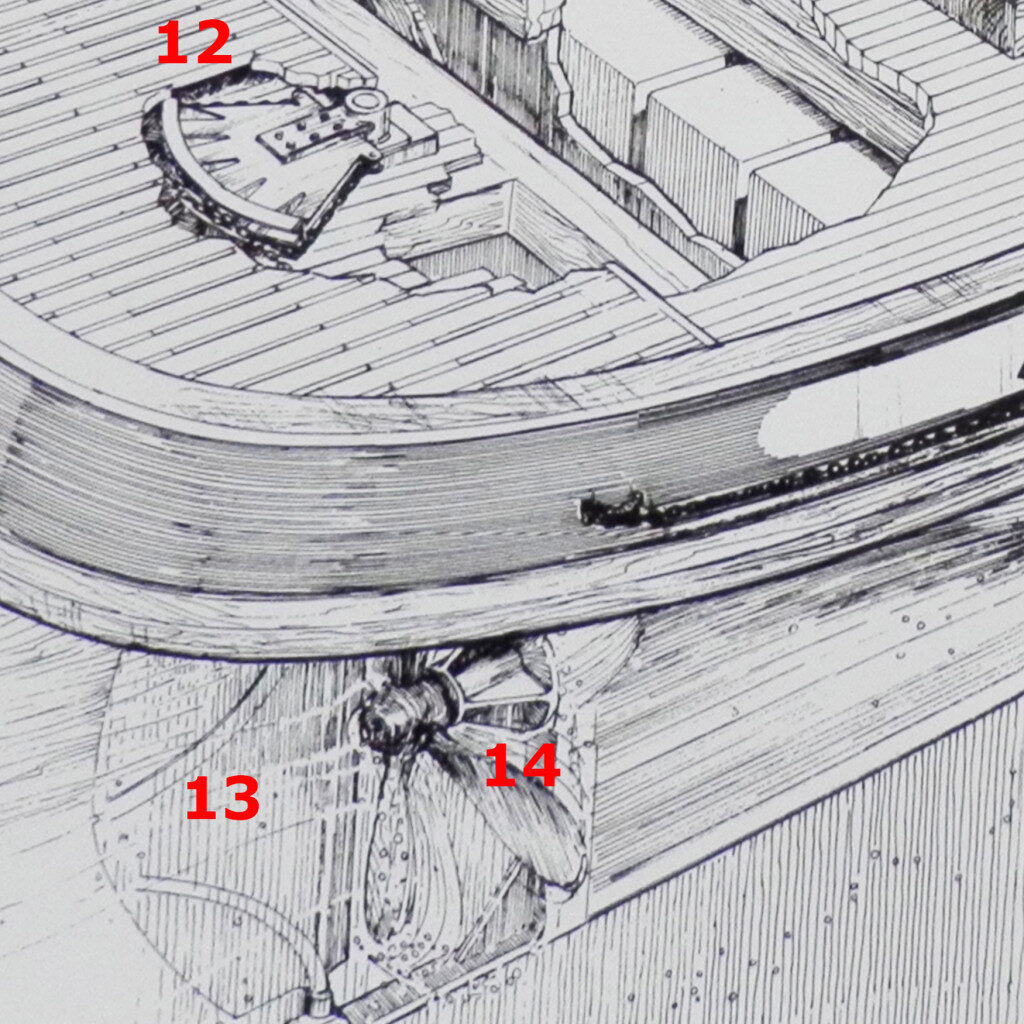 Input from the wheel house is transferred to the steam powered steering engine and rudder quadrant (12) and the rudder (13). The steam engine’s 330 hp drives an 8′ diameter, 9 pitch propeller (14).