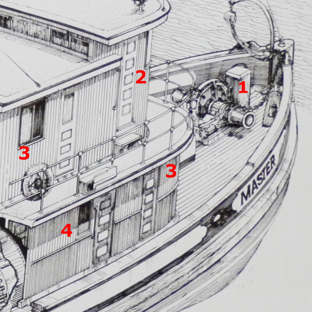 The steam anchor winch (1) is located at the bow of the ship. There are four crew births located below deck as well as one crew cabin 3), starboard side on the main deck. The galley (4) is just aft of the crew cabin. The wheel house and captain’s quarters (2) and first mate’s cabin (3) are on the top deck.