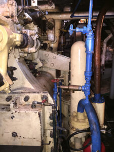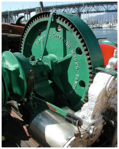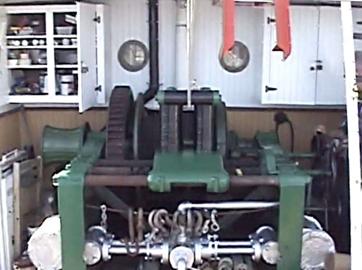 The diagram below is of a typical Scotch Boiler, similar to the one fitted in the Master. Fuel for the boiler, bunker oil or diesel, is carried in a 6,300 gallon tank forward under the main deck. The original tank was 10,000 gallons however, the top 2 feet had to be removed because of corrosion, reducing it’s capacity.